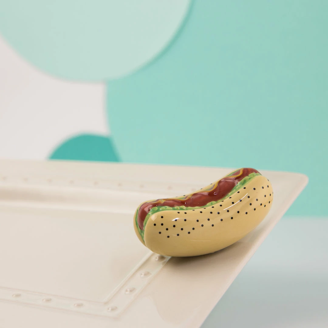 Mini hot dog with relish and mustard! Nora Fleming minis can be inserted into Nora Fleming bases and switched out to go with any occasion or event you may be hosting!