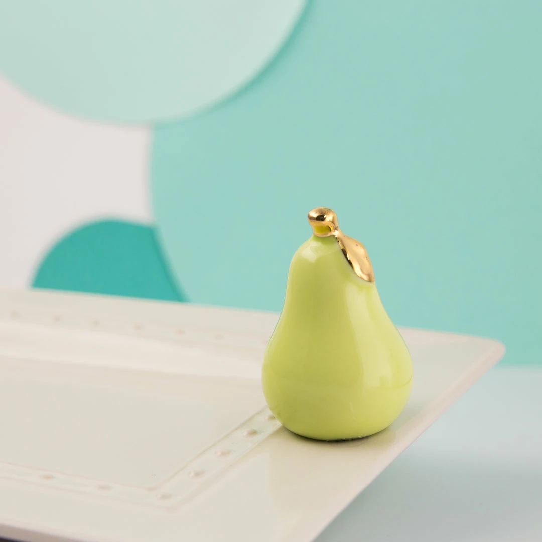 Mini green pear with gold stem and leaf. Nora Fleming minis can be inserted into Nora Fleming bases and switched out to match any occasion or event you may be hosting!